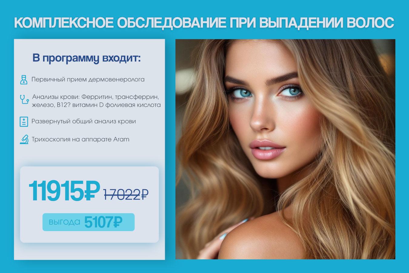 Комплексное обследование при выпадении волос (алопеции) — это профессиональная диагностика состояния кожи головы и волос с выявлением внутренних причин алопеции и подбором индивидуальной терапии. Программа проводится врачом-дерматологом, прошедшим обучение по трихологии, с применением лабораторных исследований и аппаратной трихоскопии.